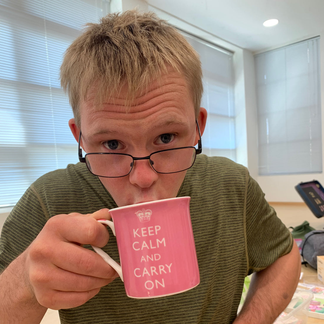 At the We Belong Market, a volunteer made Simon a cup of tea. I marvel at the simple and gentle gesture of being offered a cup of tea. Yes please! They pulled out this mug from the Marpole Neighbourhood House Kitchen cupboard and boiled water.