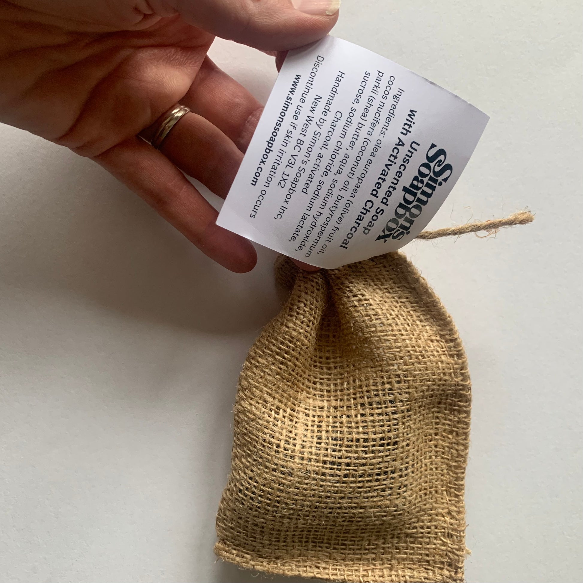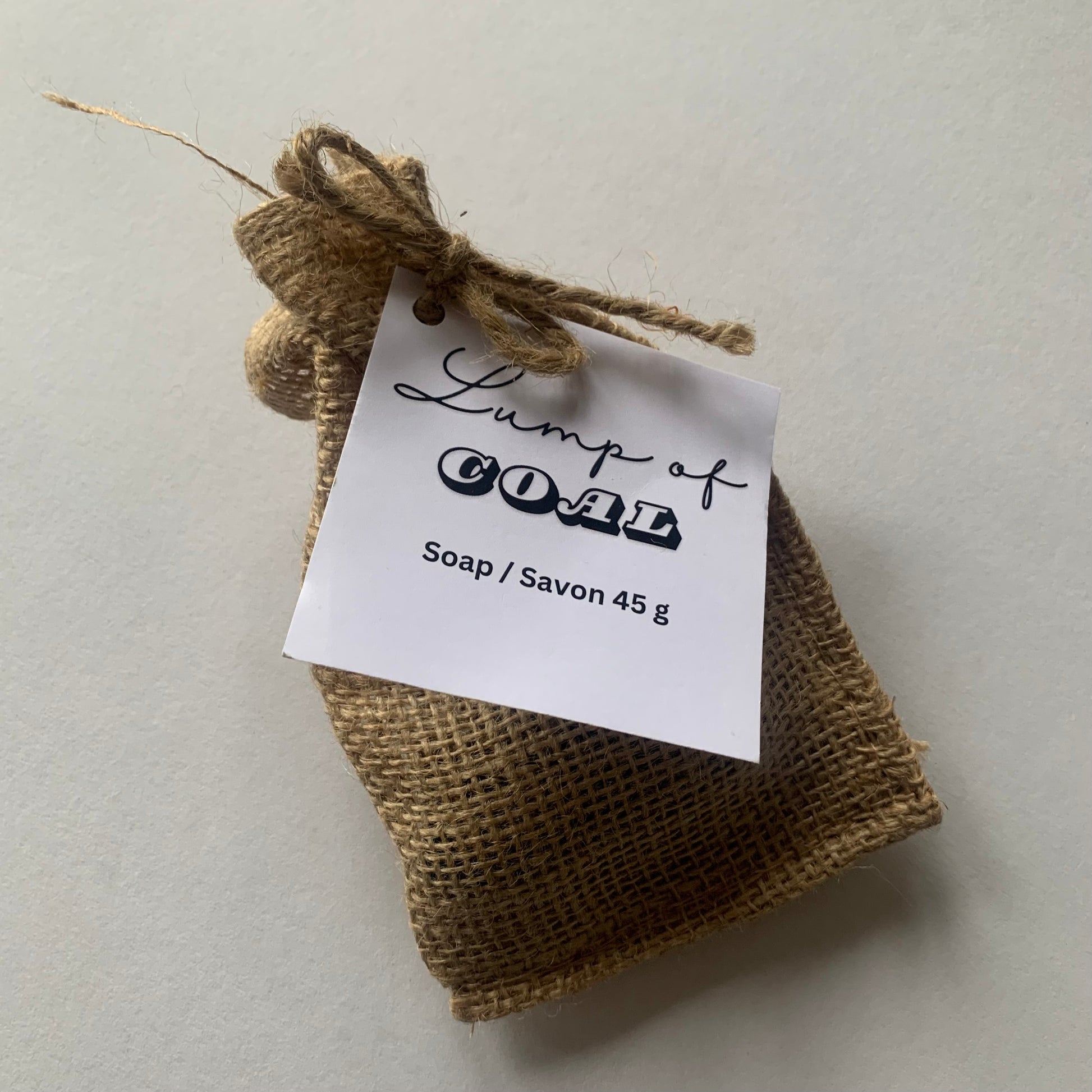 This soap (approx. 45 g) is hand cut and pounded to look like a lump of coal. Each piece will look different and comes in a burlap sack with a paper label with an ingredient list.